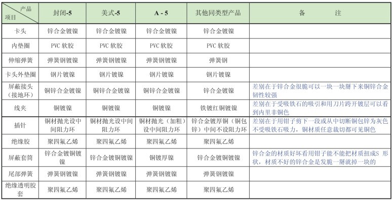 ???? 1.如果是普通的BNC头(封闭式和美式),这种的线夹和插针是铜的(当然也不排除市场上那些铁针镀铜或铁质的线夹),只有卡口弹簧和尾部弹簧(钢材质)为带铁质材料,其他部件为锌合金,这种的BNC头抗腐蚀能力一般般,外观也很粗糙,我做过市场调查,这种的屏蔽层设计也不到位,在卡头那里接触不好(建议尽量不使用)。